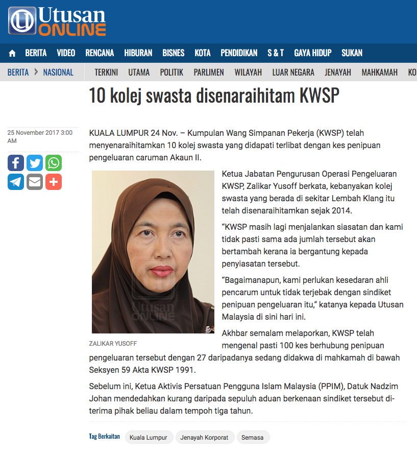 Artikel Penuh: http://www.utusan.com.my/berita/nasional/10-kolej-swasta-disenaraihitam-kwsp-1.560163#ixzz4zcaCsfcQ