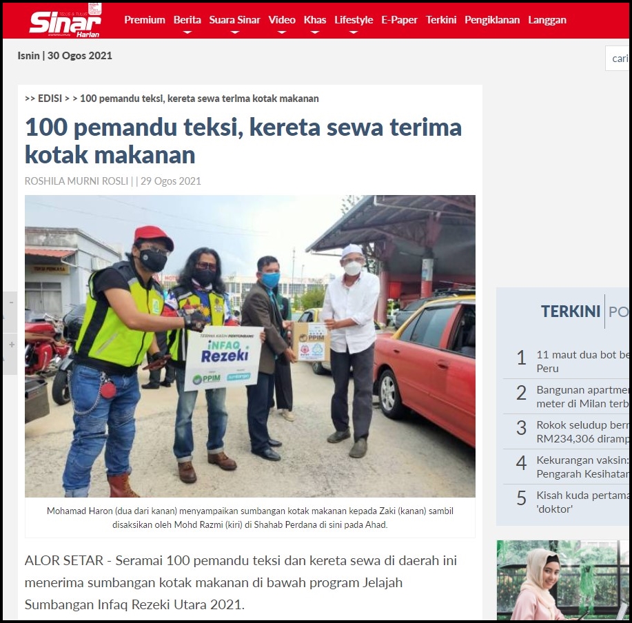 ALOR SETAR – Seramai 100 pemandu teksi dan kereta sewa di daerah ini menerima sumbangan kotak makanan di bawah program Jelajah Sumbangan Infaq Rezeki Utara 2021.