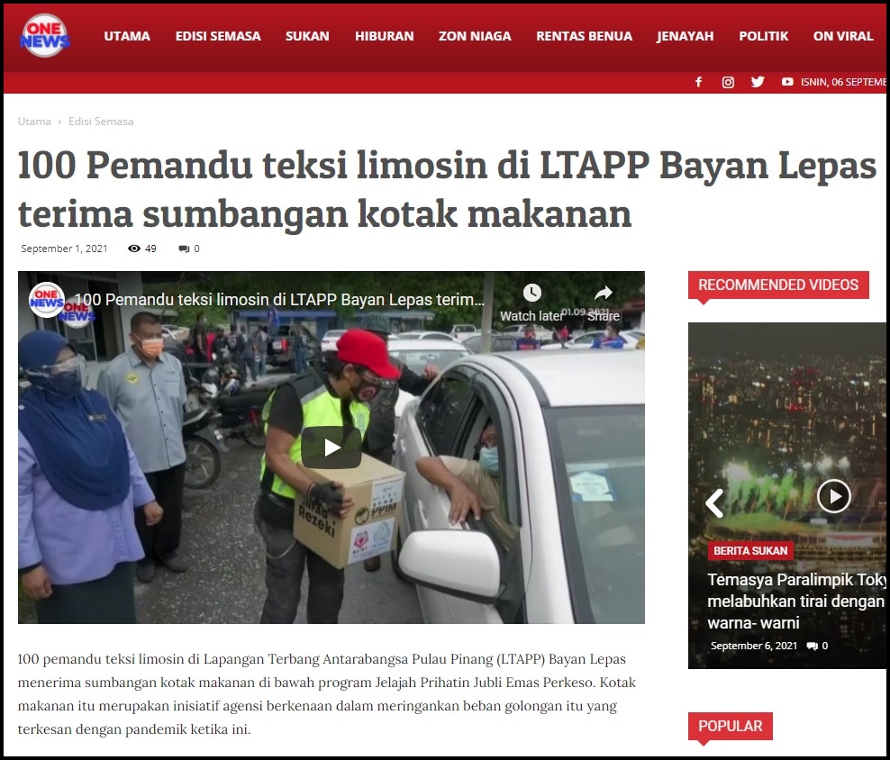 100 pemandu teksi limosin di Lapangan Terbang Antarabangsa Pulau Pinang (LTAPP) Bayan Lepas menerima sumbangan kotak makanan di bawah program Jelajah Prihatin Jubli Emas Perkeso. Kotak makanan itu merupakan inisiatif agensi berkenaan dalam meringankan beban golongan itu yang terkesan dengan pandemik ketika ini.