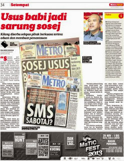 Harian Metro bertajuk `Sosej Usus Babi’ pada 15 Mac 2005 dan `SMS Sabotaj’ (18