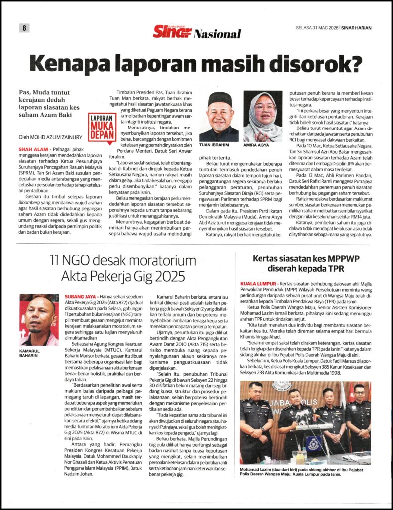 11 NGO DESAK MORATORIUM AKTA PEKERJA GIG 2025 – SINAR HARIAN – 31/03/2026