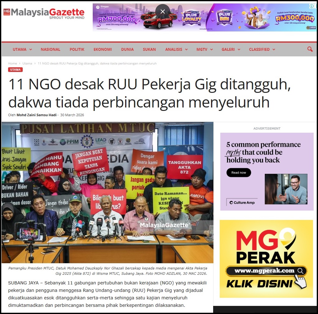 11 NGO DESAK RUU PEKERJA GIG DITANGGUH, DAKWA TIADA PERBINCANGAN MENYELURUH – MALAYSIA GAZETTE – 30/03/2026