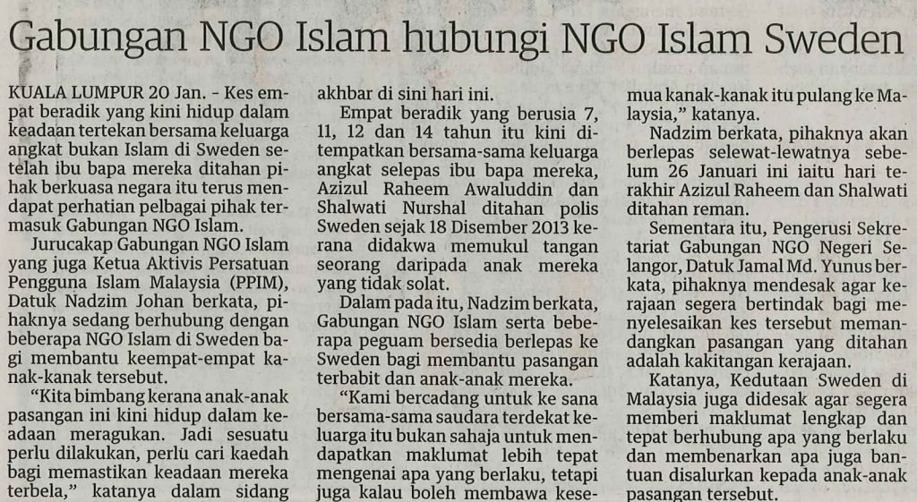 1124)UTUSAN MALAYSIA 21/1/2014 GABUNGAN NGO ISLAM HUBUNGI NGO ISLAM SWEDEN