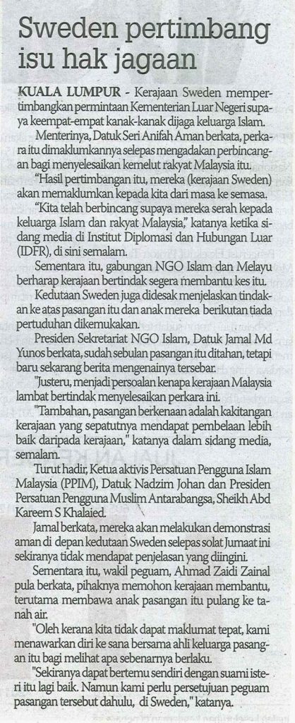 1126) SINAR HARIAN 21/1/2014 SWEDEN PERTIMBANG ISU HAK JAGAAN