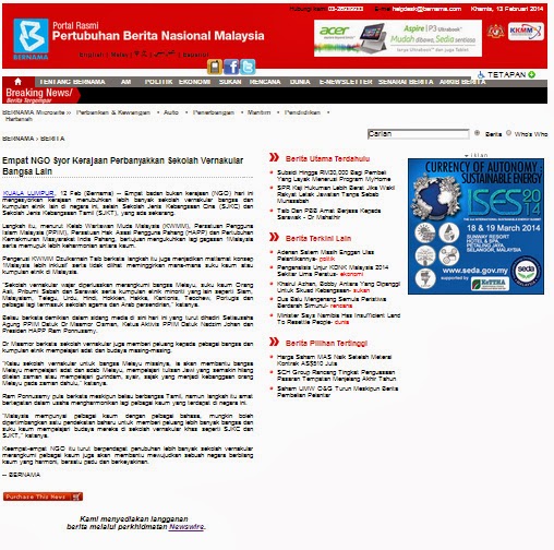 1155) BERNAMA 13/2/2014 EMPAT NGO SYOR KERAJAAN PERBANYAKKAN SEKOLAH VERNAKULAR BANGSA LAIN