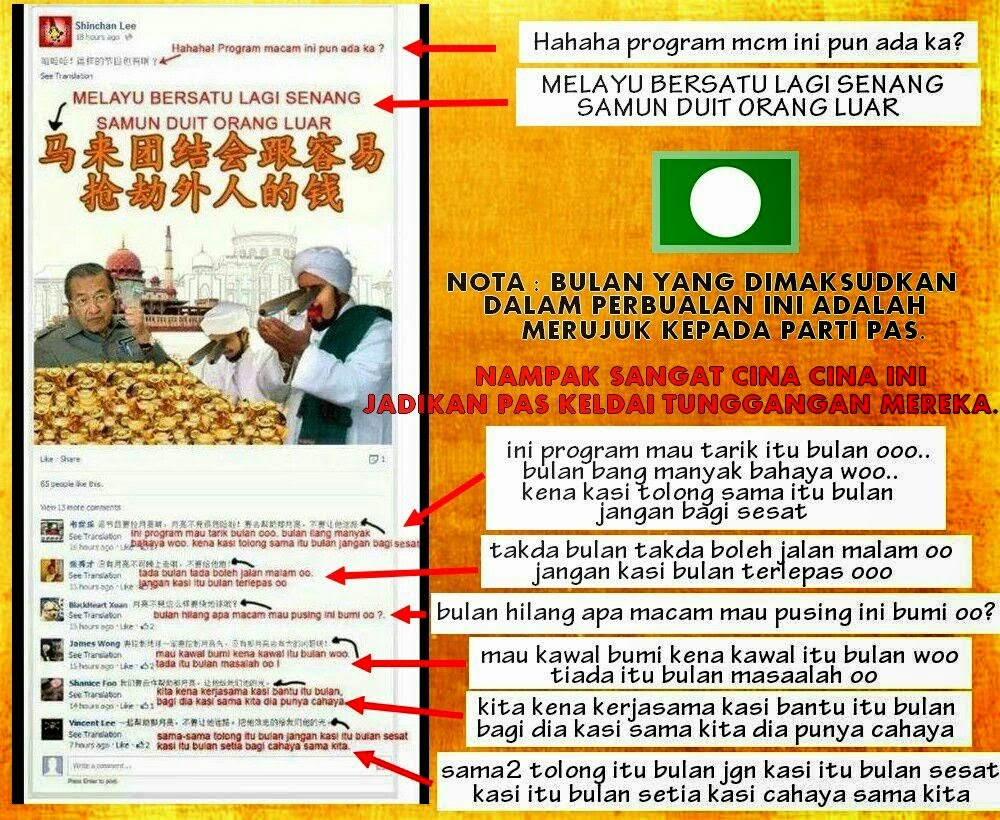 Poster yang bertajuk “Melayu bersatu lagi senang samun duid orang luar” dan Cacian dalam tulisan cina ini banyak disiarkan di laman-laman sosial seperti Facebook dan Twitter.
