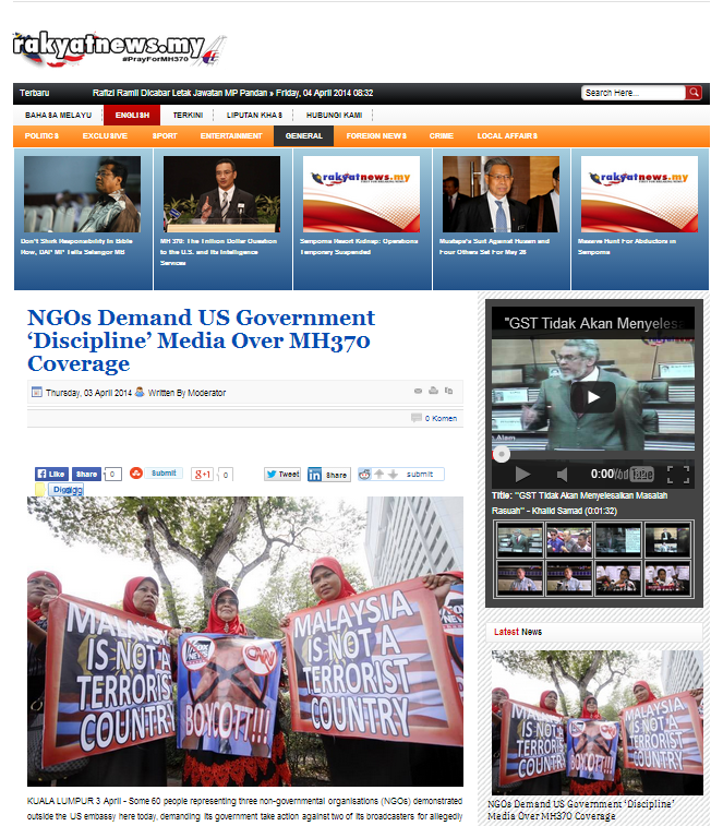 KUALA LUMPUR 3 April – Some 60 people representing three non-governmental organisations (NGOs) demonstrated outside the US embassy here today, demanding its government take action against two of its broadcasters for allegedly “irresponsible” coverage of the Malaysia Airlines aviation crisis.