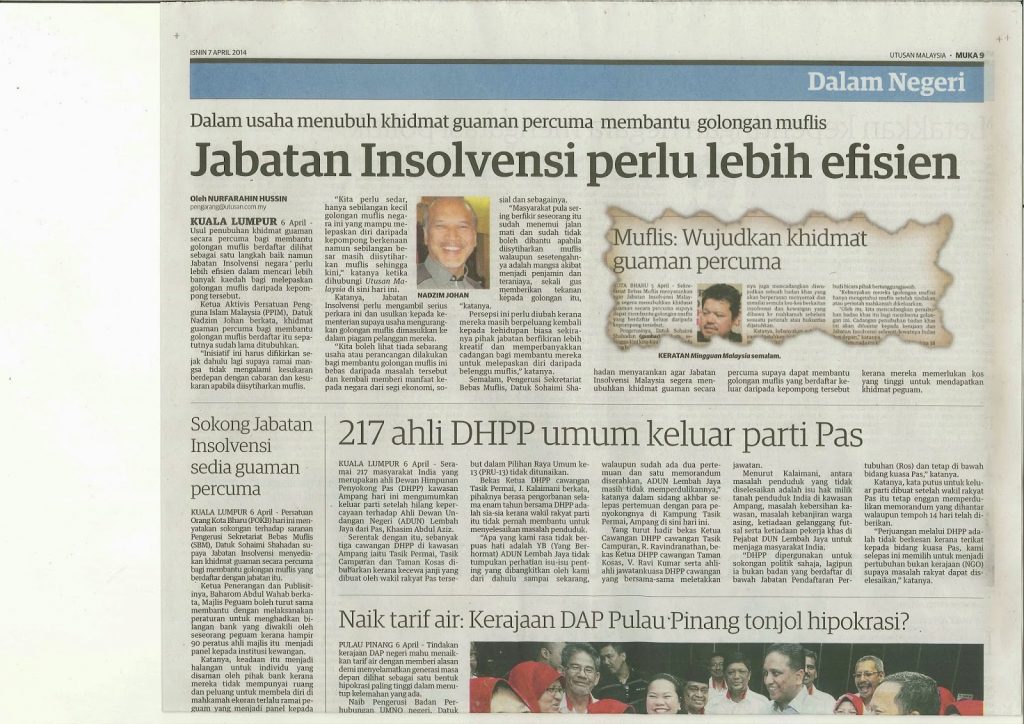 Semalam, Pengerusi Sekretariat Bebas Muflis, Datuk Sohaimi Shahadan menyarankan agar Jabatan Insolvensi Malaysia segera menubuhkan khidmat guaman secara percuma supaya dapat membantu golongan muflis yang berdaftar keluar daripada kepompong tersebut kerana mereka memerlukan kos yang tinggi untuk mendapatkan khidmat peguam.