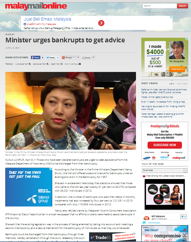 She said in a statement here today that statistics showed that those who came to the MdI last year rose by 51 per cent to 39,279 compared with 26,021 individuals in 2012.According to the Minister in the Prime Minister’s Department Nancy Shukri, the MdI still offered a second chance for bankrupts under an existing provision in the Bankruptcy Act 1967.