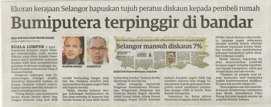 KUALA LUMPUR 9 April – Keputusan kerajaan negeri Selangor memansuhkan tujuh peratus diskaun yang diberi kepada bumiputera untuk pembelian kediaman mampu milik akan mengakibatkan golongan berkenaan terpinggir daripada menjadi pemastautin tetap di kawasan bandar.