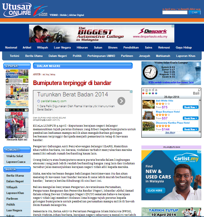 1848) 9 APRIL 2014 UTUSAN ONLINE – BUMIPUTRA TERPINGGIR DI BANDAR