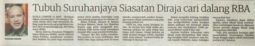 KUALA LUMPUR 14 April – Kerajaan digesa menubuhkan Suruhanjaya Siasatan Diraja (RCI) bagi menyiasat dalang yang menyokong pergerakan tentera siber propembangkang, Red Bean Army (RBA).