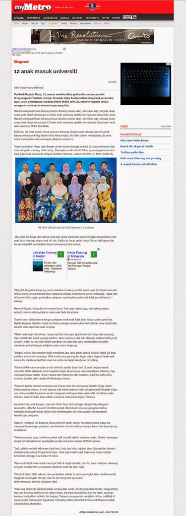 “Alhamdulillah rasanya usaha arwah berbaloi apabila lapan dari 12 anak berjaya masuk universiti. Boleh dikatakan rezeki apabila hampir kesemuanya menerima tajaan biasiswa. Tiga mendapat tajaan belajar di luar negara iaitu Melbourne dan Adelaide, Australia serta Ohio, Amerika Syarikat oleh Jabatan Perkhidmatan Awam.