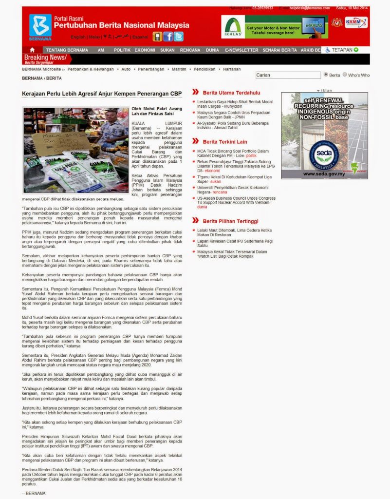 “Tambahan pula isu CBP ini dipolitikkan pembangkang sebagai satu sistem percukaian yang membebankan pengguna, oleh itu pihak bertanggungjawab perlu mempergiatkan usaha mereka memberi penerangan penuh kepada masyarakat mengenai pelaksanaannya,” katanya kepada Bernama di sini, hari ini.