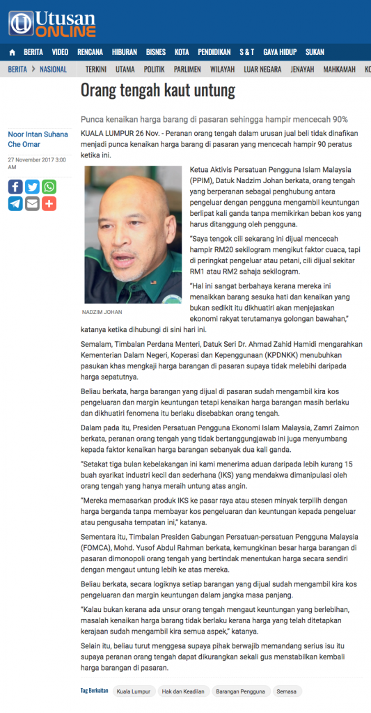 Ketua Aktivis Persatuan Pengguna Islam Malaysia (PPIM), Datuk Nadzim Johan berkata, orang tengah yang berperanan sebagai penghubung antara pengeluar dengan pengguna mengambil keuntungan berlipat kali ganda tanpa memikirkan beban kos yang harus ditanggung oleh pengguna.