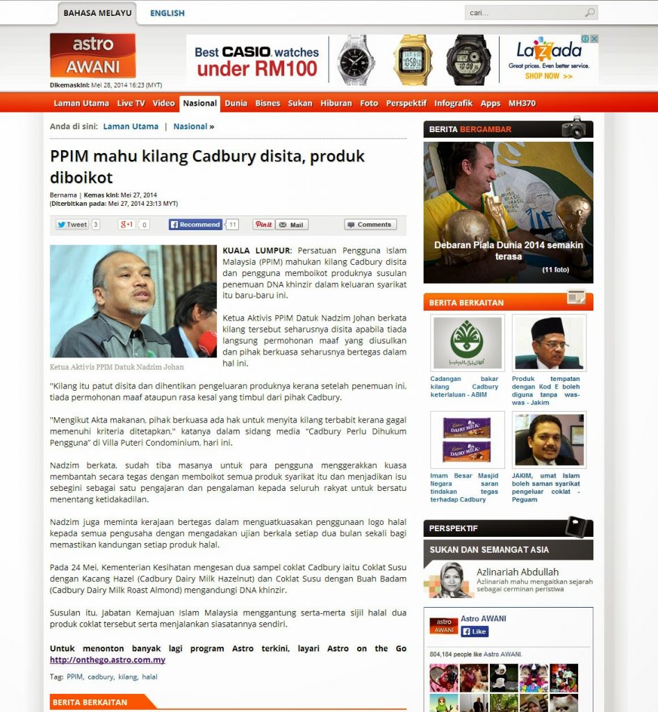 Pada 24 Mei, Kementerian Kesihatan mengesan dua sampel coklat Cadbury iaitu Coklat Susu dengan Kacang Hazel (Cadbury Dairy Milk Hazelnut) dan Coklat Susu dengan Buah Badam (Cadbury Dairy Milk Roast Almond) mengandungi DNA khinzir.