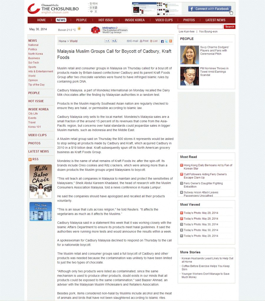 Cadbury Malaysia only sells to the local market. Mondelez’s Malaysia sales are a small fraction of the around 15 percent of its revenues that come from the Asia-Pacific region, but concerns over halal standards could jeopardize sales in bigger Muslim markets, such as Indonesia and the Middle East.