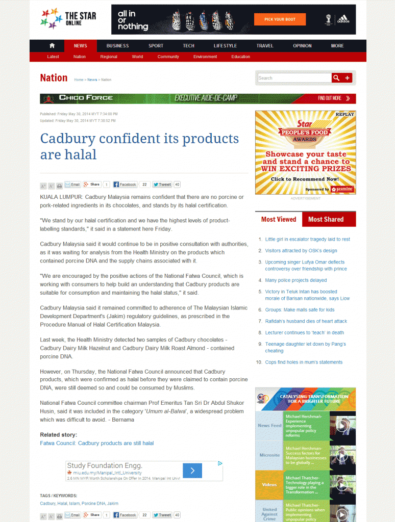 1978) THE STAR 30/5/2014 – Cadbury confident its products are halal