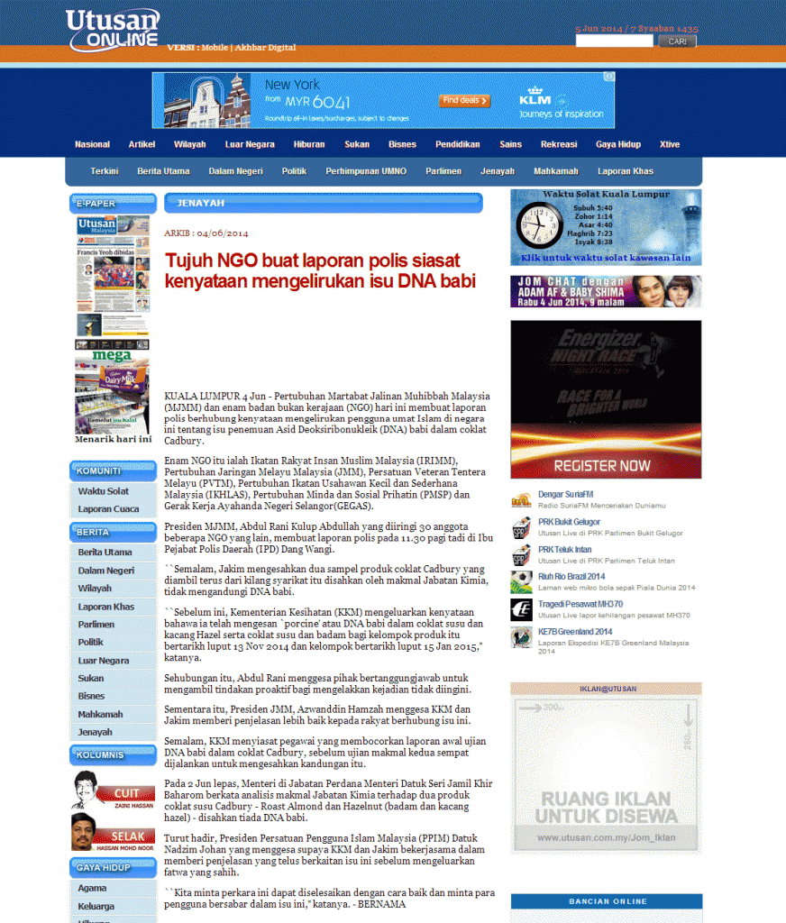 1995)utusan online 4/6/2014 – Tujuh NGO buat laporan polis siasat kenyataan mengelirukan isu DNA babi