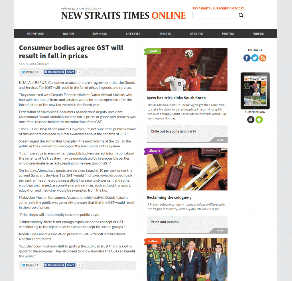 2007) NEWS STREATS TIME 11/6/2014 – Consumer bodies agree GST will result in fall in prices