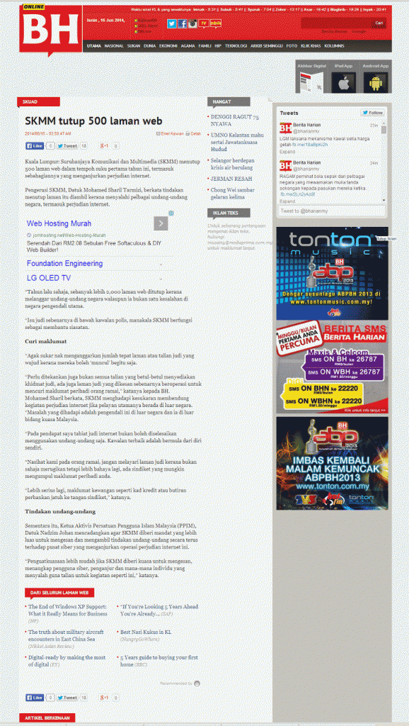 2014/06/15 – 03:50:47 AM Kuala Lumpur: Suruhanjaya Komunikasi dan Multimedia (SKMM) menutup 500 laman web dalam tempoh suku pertama tahun ini, termasuk sebahagiannya yang menganjurkan perjudian internet.