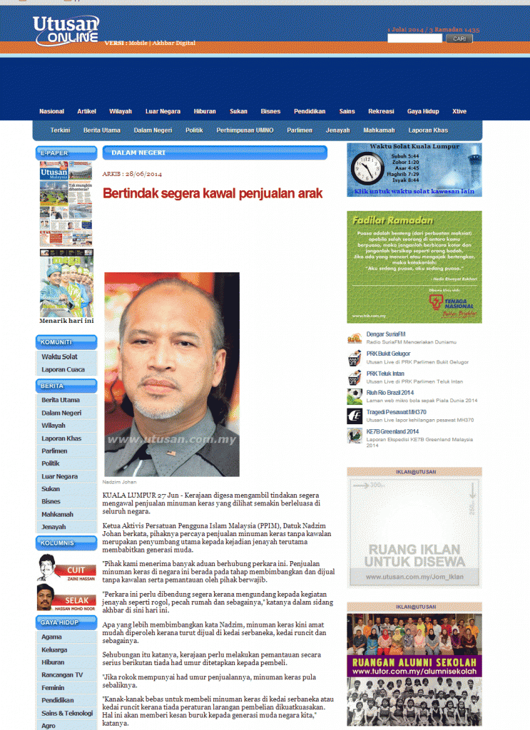 Artikel Penuh: http://www.utusan.com.my/utusan/Dalam_Negeri/20140628/dn_26/Bertindak-segera-kawal-penjualan-arak#ixzz36BCJfnwc