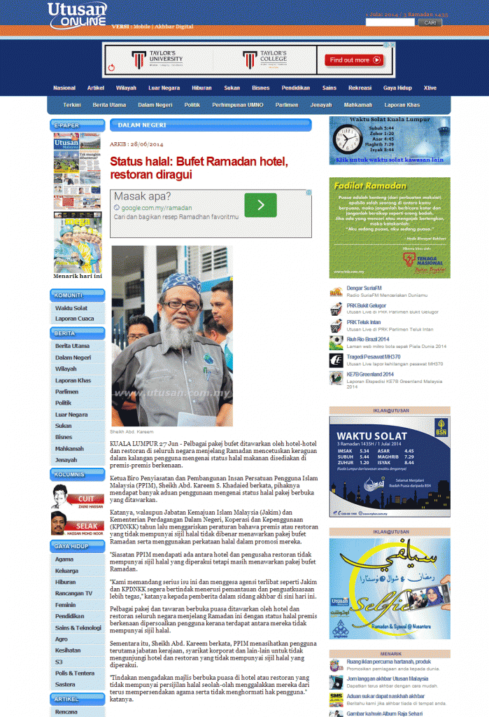 2030) UTUSAN MALAYSIA 27/06/2014 – Status halal: Bufet Ramadan hotel, restoran diragui