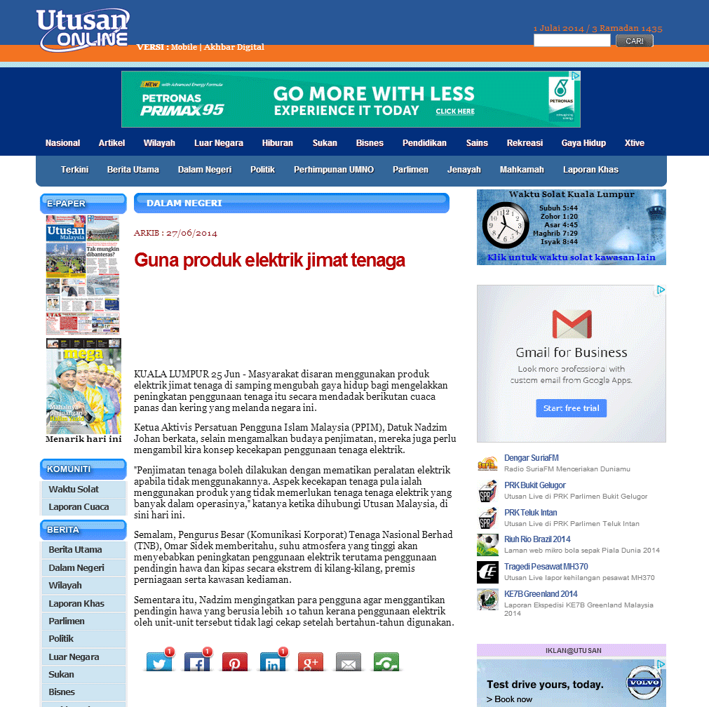 Semalam, Pengurus Besar (Komunikasi Korporat) Tenaga Nasional Berhad (TNB), Omar Sidek memberitahu, suhu atmosfera yang tinggi akan menyebabkan peningkatan penggunaan elektrik terutama penggunaan pendingin hawa dan kipas secara ekstrem di kilang-kilang, premis perniagaan serta kawasan kediaman.
