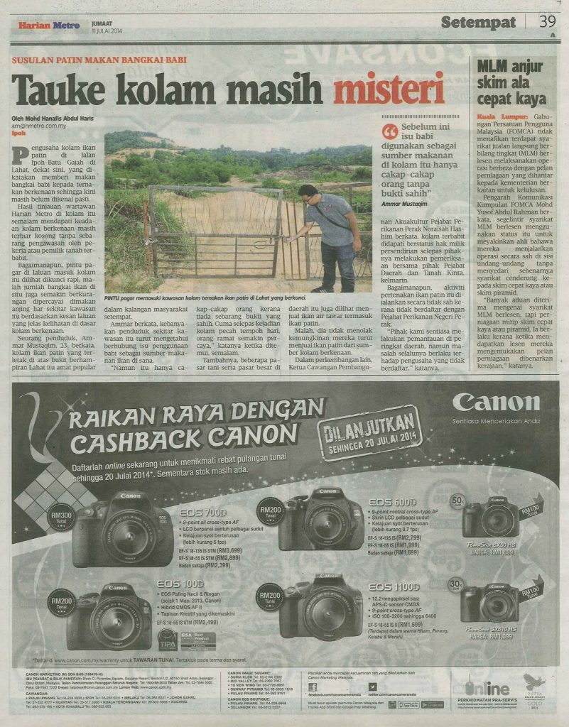 Dalam perkembangan lain, Ketua Cawangan Pembangunan Akuakultur Pejabat Perikanan Perak Noraisah Hashim berkata, kolam terbabit didapati berstatus hak milik persendirian selepas pihaknya melakukan pemeriksaan bersama pihak Pejabat Daerah dan Tanah Kinta, kelmarin.