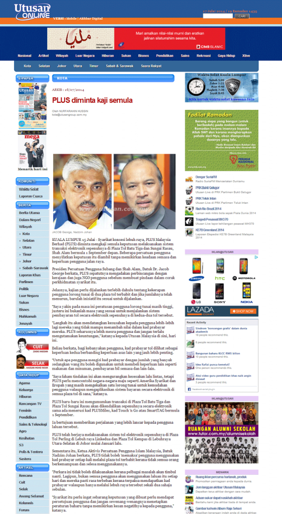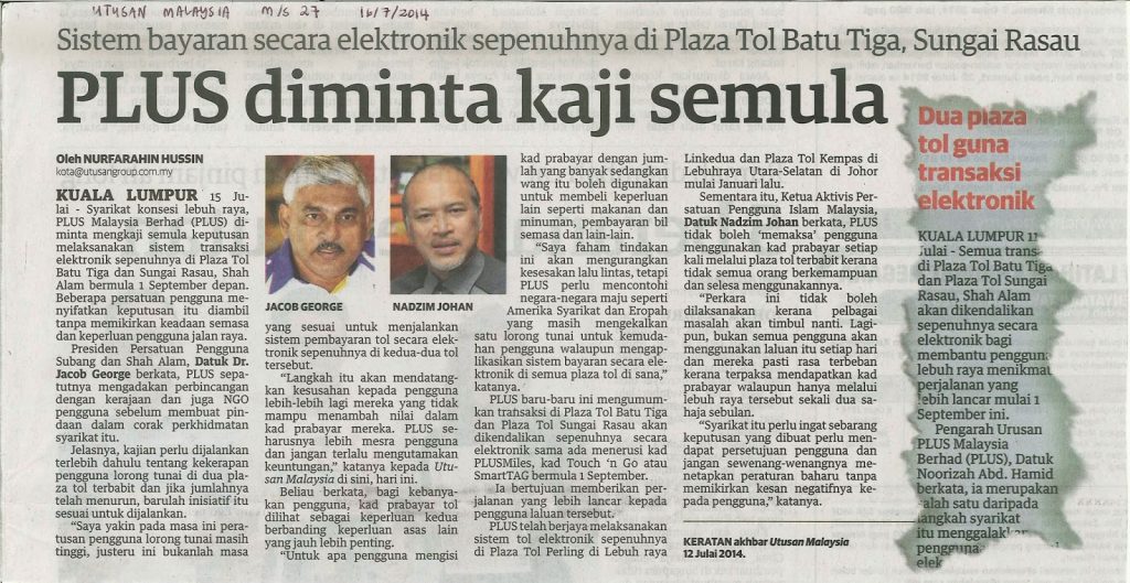 KUALA LUMPUR 15 Julai – Syarikat konsesi lebuh raya, PLUS Malaysia Berhad (PLUS) diminta mengkaji semula keputusan melaksanakan sistem transaksi elektronik sepenuhnya di Plaza Tol Batu Tiga dan Sungai Rasau, Shah Alam bermula 1 September depan. Beberapa persatuan pengguna menyifatkan keputusan itu diambil tanpa memikirkan keadaan semasa dan keperluan pengguna jalan raya.