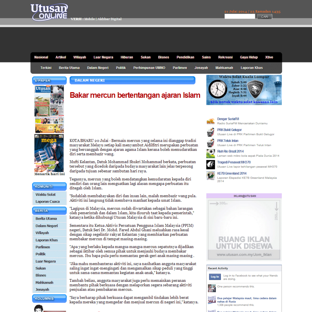 Artikel Penuh: http://www.utusan.com.my/utusan/Dalam_Negeri/20140721/dn_25/Bakar-mercun-bertentangan-ajaran-Islam#ixzz384QHRdkJ