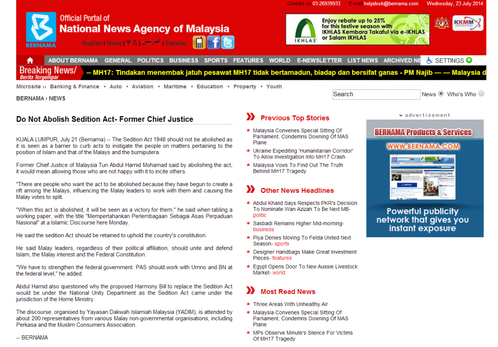 Former Chief Justice of Malaysia Tun Abdul Hamid Mohamad said by abolishing the act, it would mean allowing those who are not happy with it to incite others.