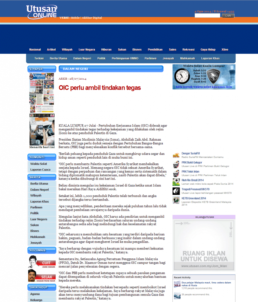 Artikel Penuh: http://www.utusan.com.my/utusan/Dalam_Negeri/20140728/dn_18/OIC-perlu-ambil-tindakan-tegas#ixzz39ORJpf3u