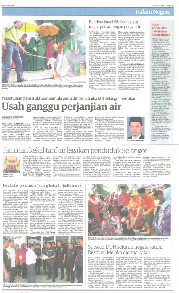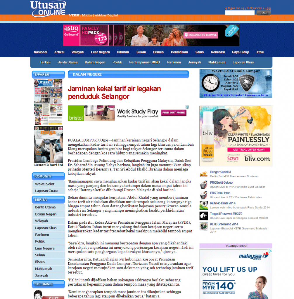 2075) UTUSAN 4/8/2014- Jaminan kekal tarif air legakan penduduk Selangor – PPIM
