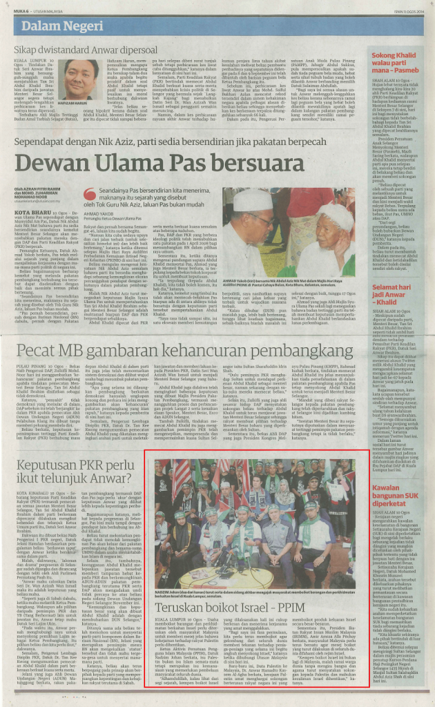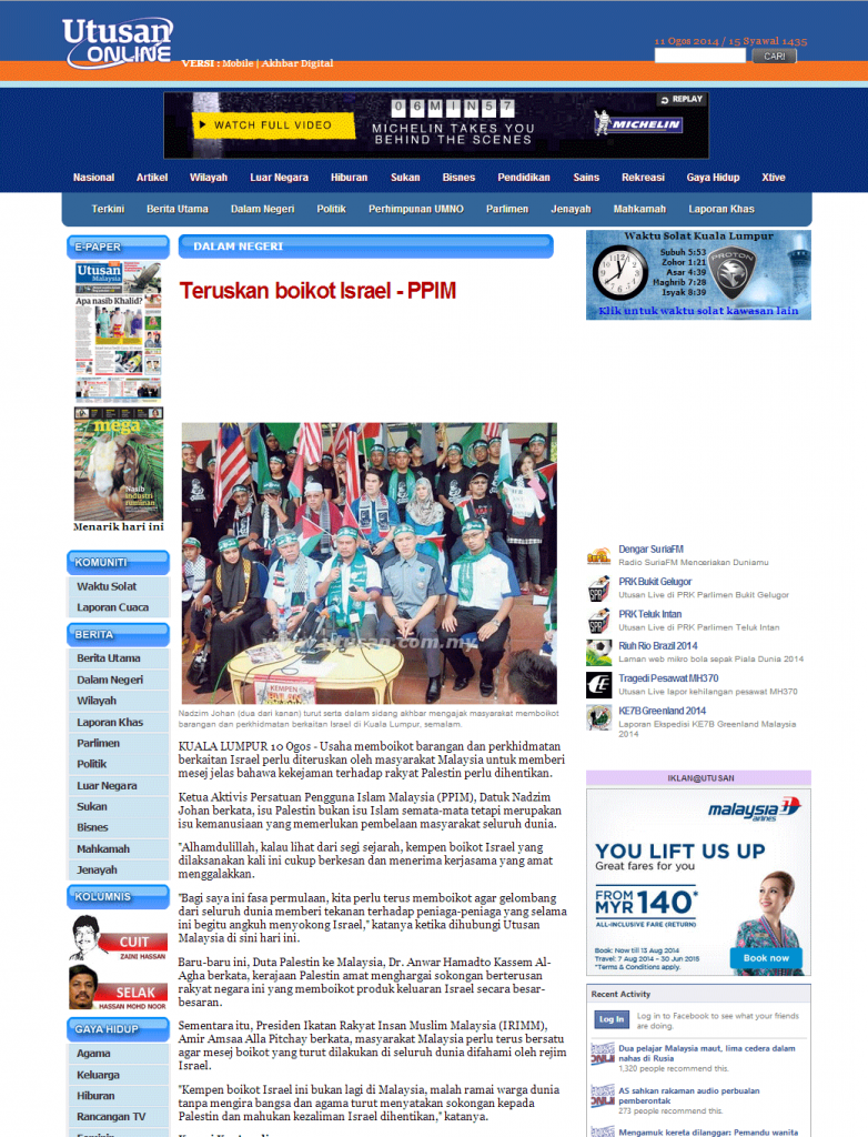 Artikel Penuh: http://www.utusan.com.my/utusan/Dalam_Negeri/20140811/dn_03/Teruskan-boikot-Israel—PPIM#ixzz3A3Mkm2qj