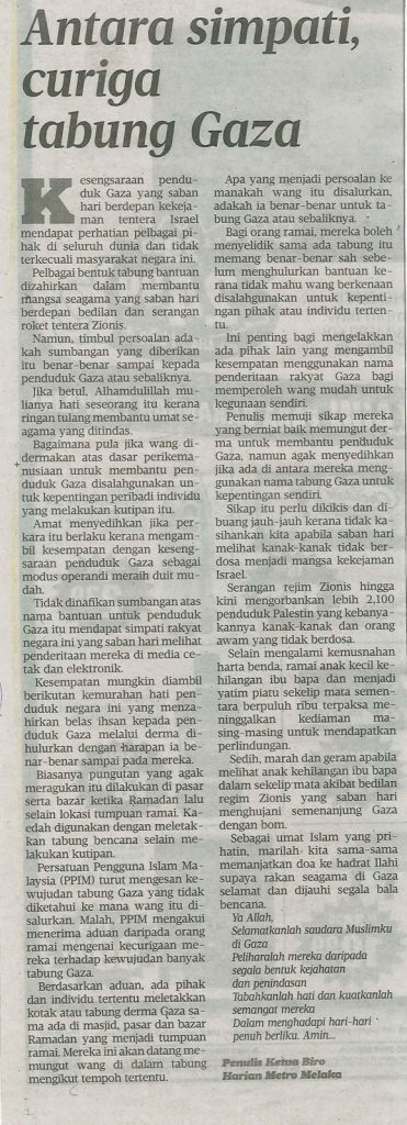 2115) ARKIB BERITA PPIM – 29/8/2014 HARIAN METRO – Antara Simpati, Curiga Tabung Gaza