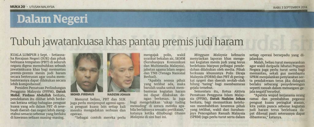 2122) ARKIB BERITA PPIM – 03/8/2014 UTUSAN MALAYSIA – Tubuh Jawatankuasa Khas Pantau Premis Judi Haram