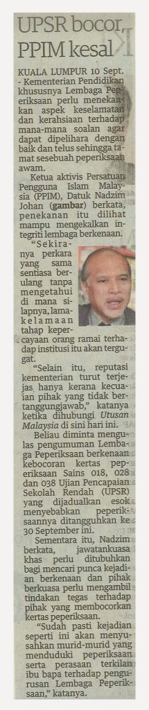 2123) ARKIB BERITA PPIM – 10/9/2014 UTUSAN MALAYSIA – UPSR Bocor, PPIM Kesal