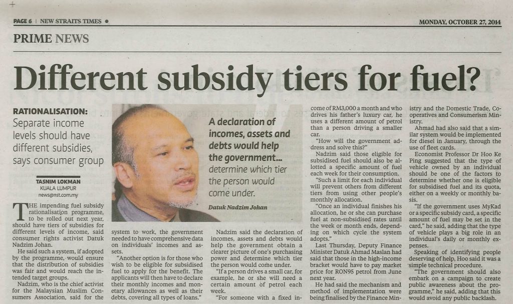 2189) NEWS STRAITS TIMES 27/10/2014 – Different Subsidy Tiers For Fuel?