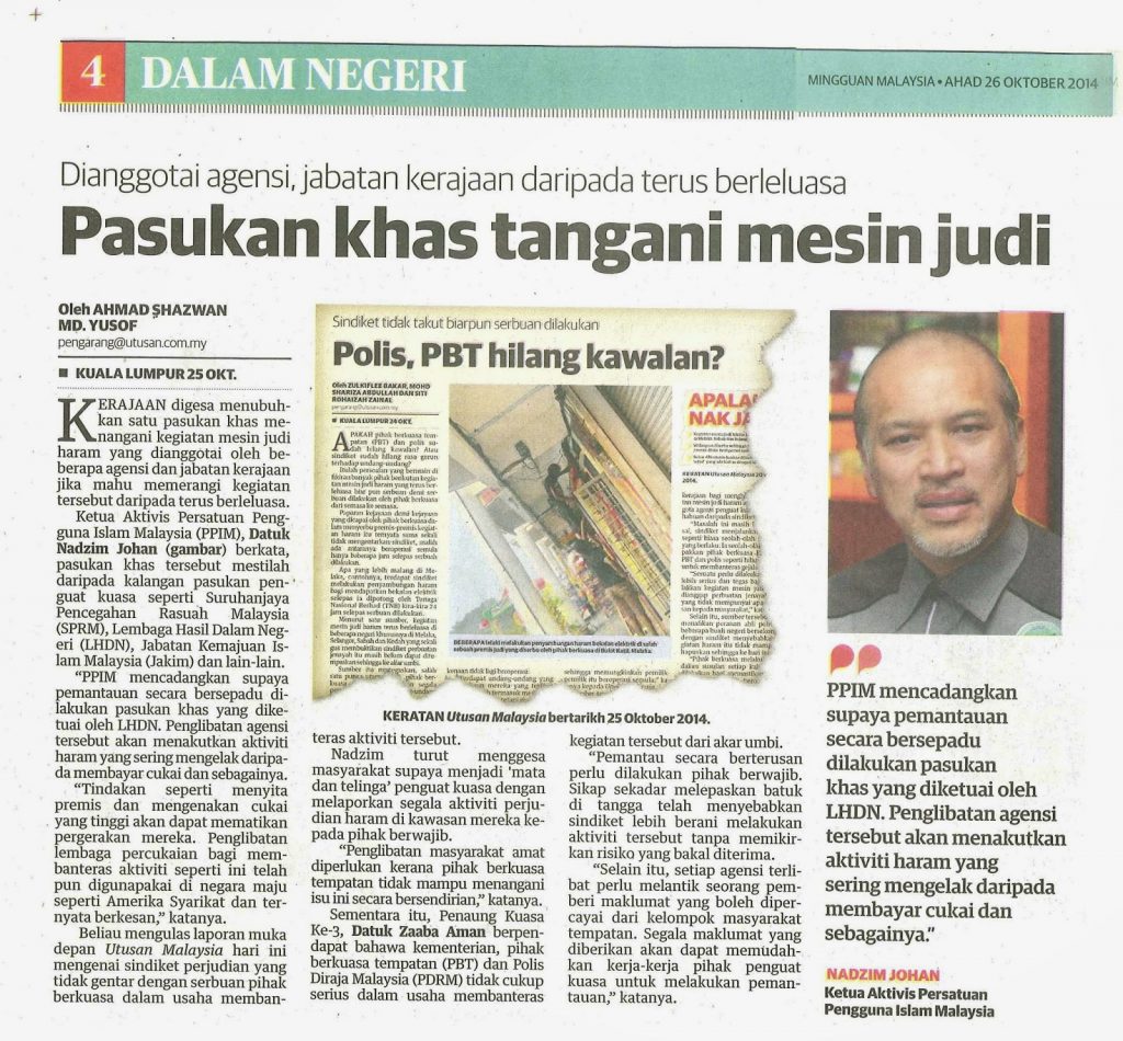Beliau mengulas laporan muka depan Utusan Malaysia hari ini mengenai sindiket perjudian yang tidak gentar dengan serbuan pihak berkuasa dalam usaha membanteras aktiviti tersebut.