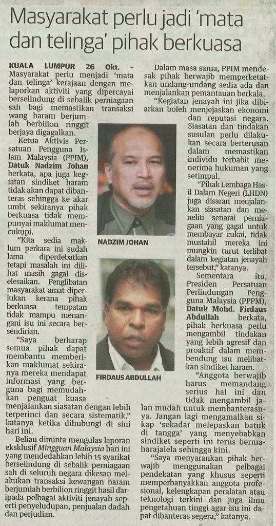 Ketua Aktivis Persatuan Pengguna Islam Malaysia (PPIM), Datuk Nadzim Johan berkata, apa juga kegiatan sindiket haram tidak akan dapat dibanteras sehingga ke akar umbi sekiranya pihak berkuasa tidak mempunyai maklumat mencukupi.