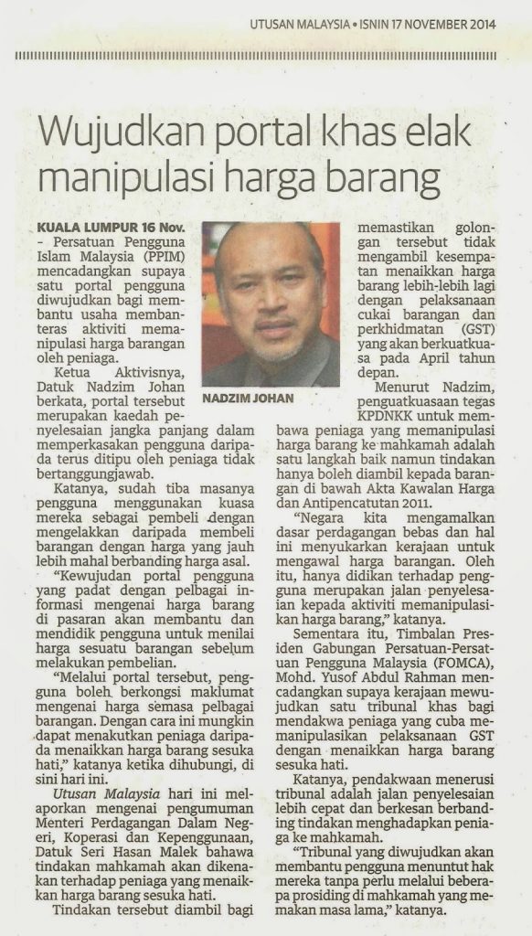 KUALA LUMPUR 16 Nov. – Persatuan Pengguna Islam Malaysia (PPIM) mencadangkan supaya satu portal pengguna diwujudkan bagi membantu usaha membanteras aktiviti memanipulasi harga barangan oleh peniaga.