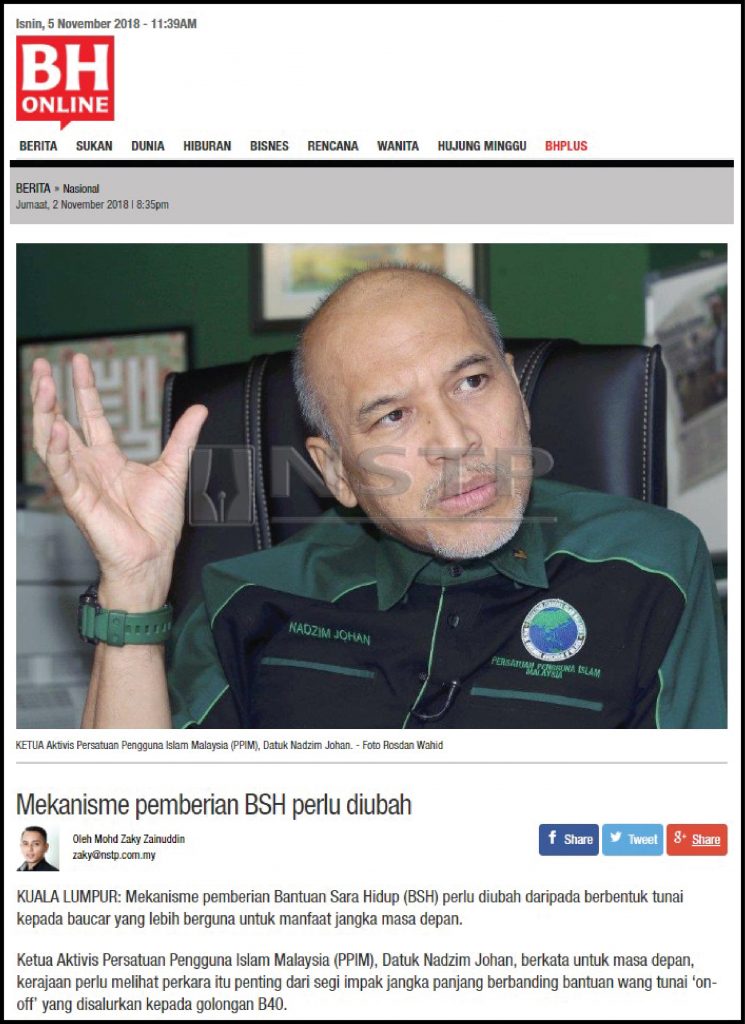 Ketua Aktivis Persatuan Pengguna Islam Malaysia (PPIM), Datuk Nadzim Johan, berkata untuk masa depan, kerajaan perlu melihat perkara itu penting dari segi impak jangka panjang berbanding bantuan wang tunai ‘on-off’ yang disalurkan kepada golongan B40.