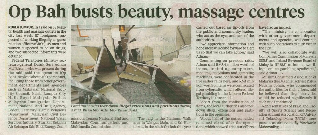 KUALA LUMPUR: In a raid on 38 beauty, health and massage outlets in the city last week, 87 foreigners, suspected of working illegally as guest relation officers (GROs); 49 men and women suspected to be on drugs; and two suspected informants were detained.