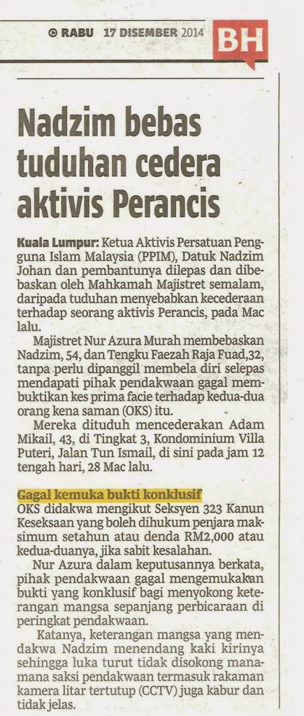 2258) BERITA HARIAN – 17/12/2014 – Nadzim Bebas Tuduhan Cedera Aktivis Perancis