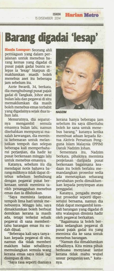 “Saya rasa seperti dianiaya kerana hanya beberapa jam sebelum itu saya diberitahu boleh ke sana untuk menebus barang,” katanya ketika membuat aduan kepada Ketua Aktivis Persatuan Pengguna Islam Malaysia (PPIM) Datuk Nadzim Johan.