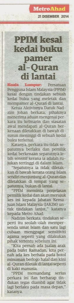 Kuala Lumpur: Persatuan Pengguna Islam Malaysia (PPIM) kesal dengan tindakan sebuah kedai buku yang meletak dan mempamer al-Quran di lantai.