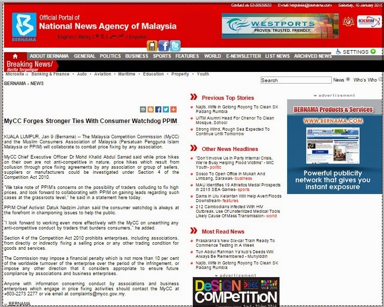 Pada 8 Januari 2015 lalu, wakil PPIM yang diketuai oleh Y Bhg Dato’ Nadzim Johan, Ketua Aktivis PPIM dan Puan Rosnani Hamid, Ketua Biro Penerangan & Propaganda PPIM telah berjumpa dengan Suruhanjaya Persaingan Malaysia (MyCC) yang diketuai oleh Ketua Pegawai Eksekutif, bersama pegawai dari unit siasatan dan unit media bagi membincangkan permasalahan semasa yang melibatkan pengguna.