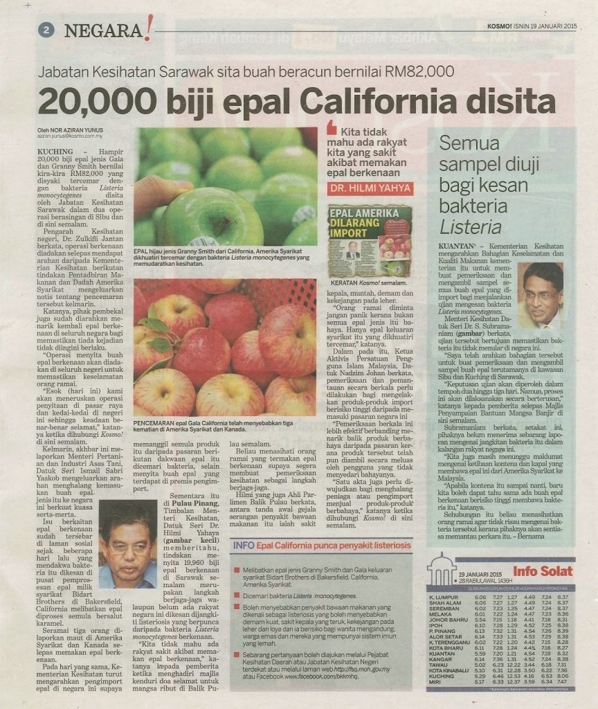 KUCHING – Hampir 20,000 biji epal jenis Gala dan Granny Smith bernilai kira-kira RM82,000 yang disyaki tercemar dengan bakteria Listeria monocytegenes disita oleh Jabatan Kesihatan Sarawak dalam dua operasi berasingan di Sibu dan di sini semalam.