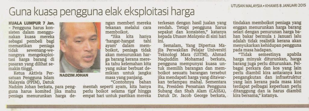 2431) ARKIB BERITA PPIM – UTUSAN MALAYSIA – 08/01/2015 – Guna Kuasa Pengguna Elak Eksploitasi Harga